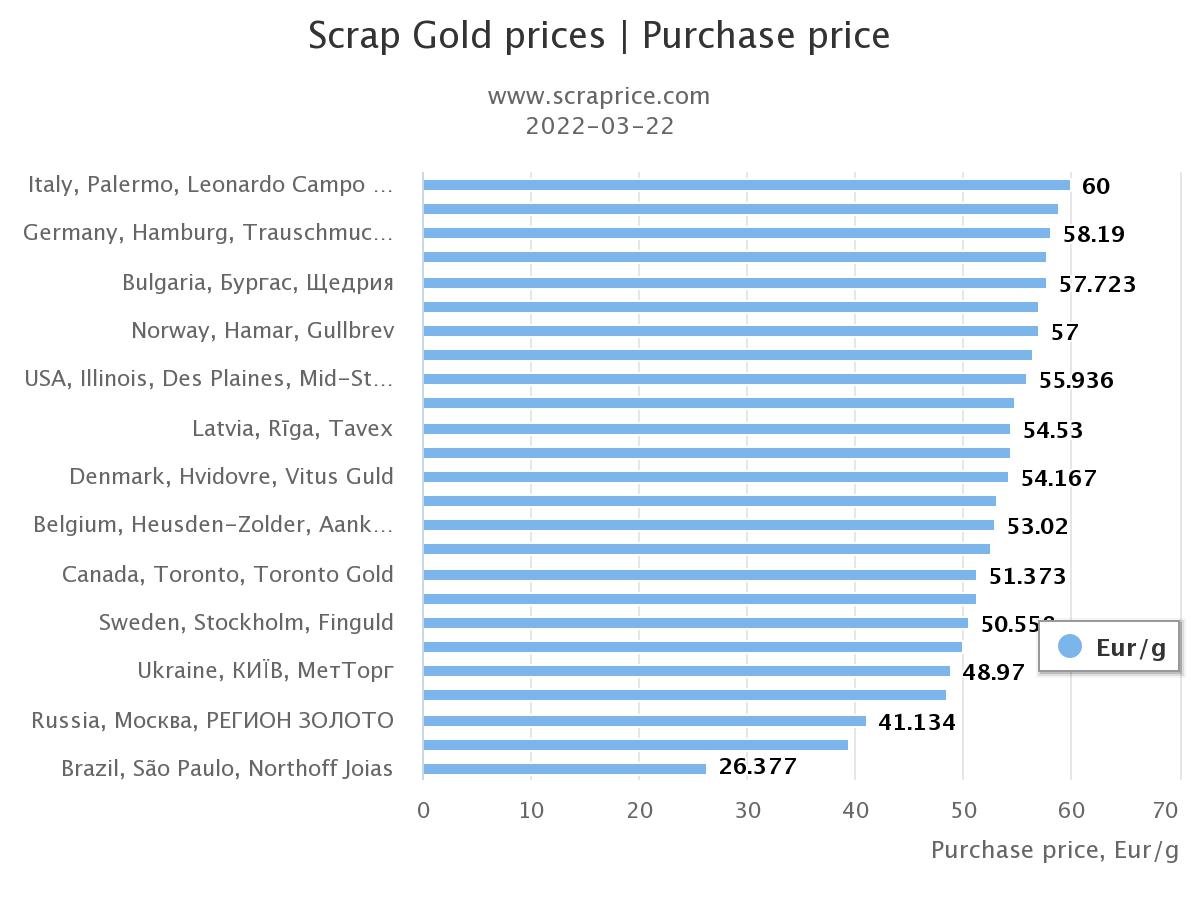 Gold buyers have also increased their gold purchase prices. According to the website scraprice.com, on March 22, 2022, 24 carat gold could be sold for as much as 60 Eur / gr. There are several countries where gold was bought the most, namely Germany, Poland and the UK.